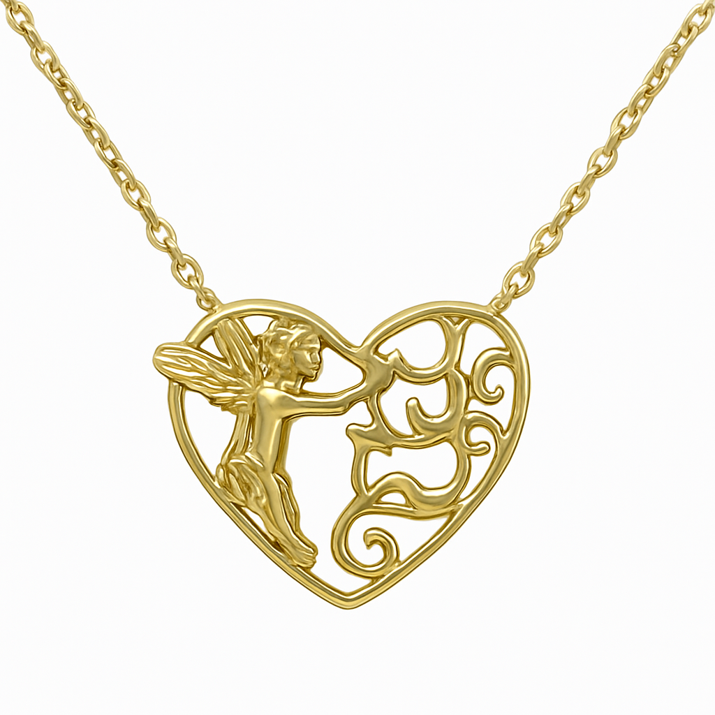Elegante cadena con dije en forma de corazón calado, que incorpora un delicado ángel en su interior, símbolo de protección, amor y guía espiritual. Una joya sutil y significativa, perfecta para uso diario o para regalar.