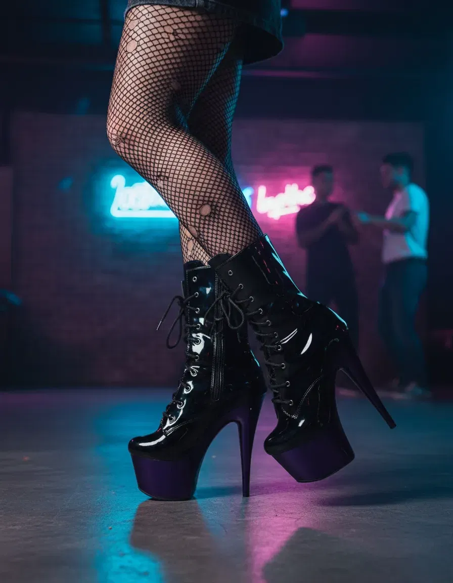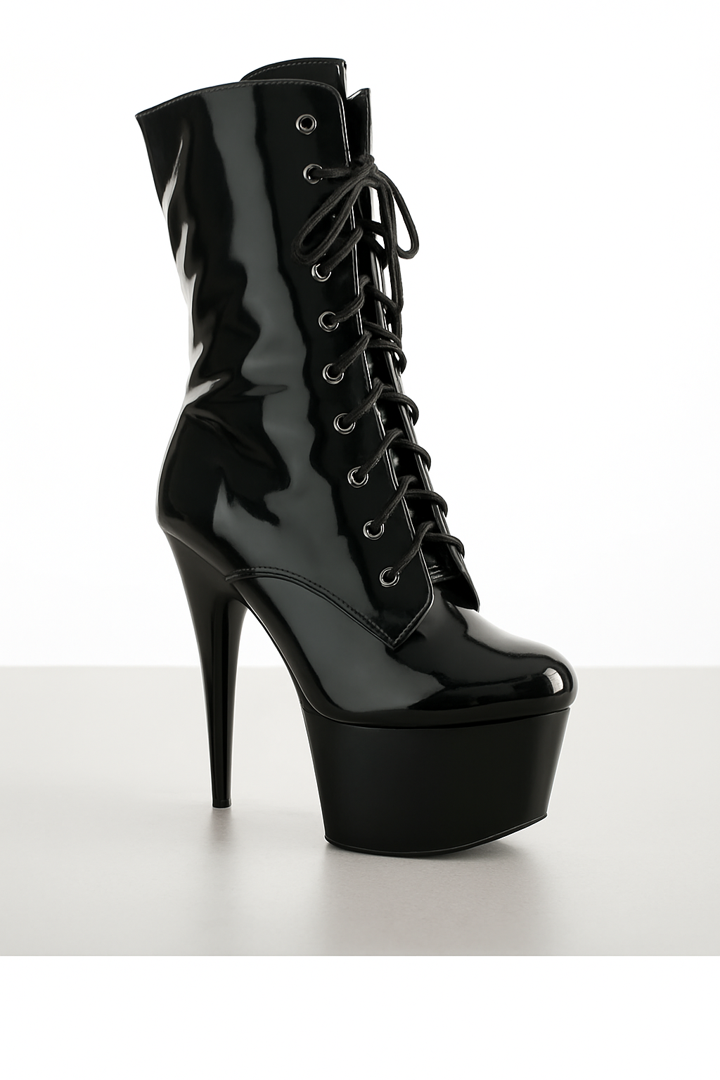 Deslumbra con esta espectacular plataforma estilo media caña de charol negro acordonada, diseñada para quienes no temen nada. Con un acabado brillante, esta bota de caña media combina sensualidad y poder en cada paso. Su diseño incluye una plataforma pronunciada, un tacón alto de aguja y cierre lateral para un ajuste perfecto. Ideal para noches de fiesta, presentaciones escénicas o estilismos audaces y atrevidos.