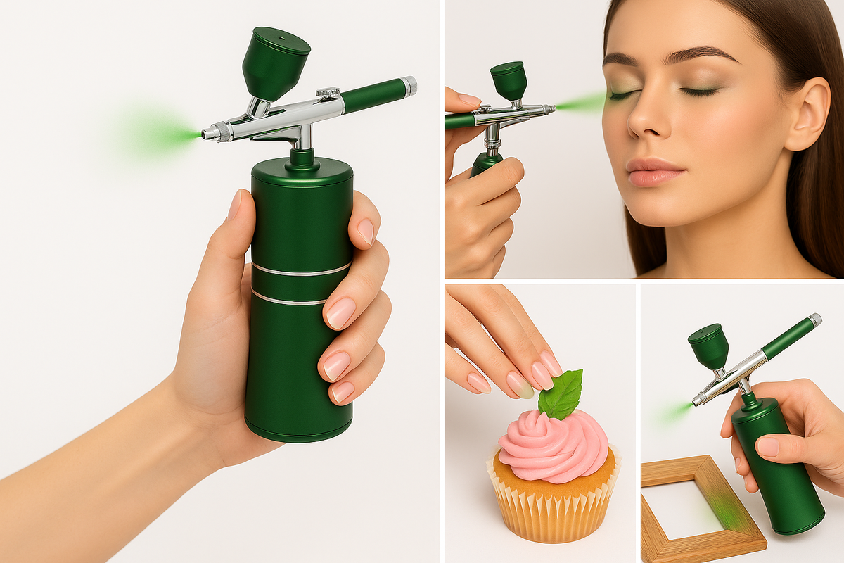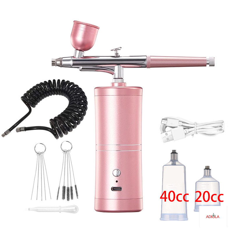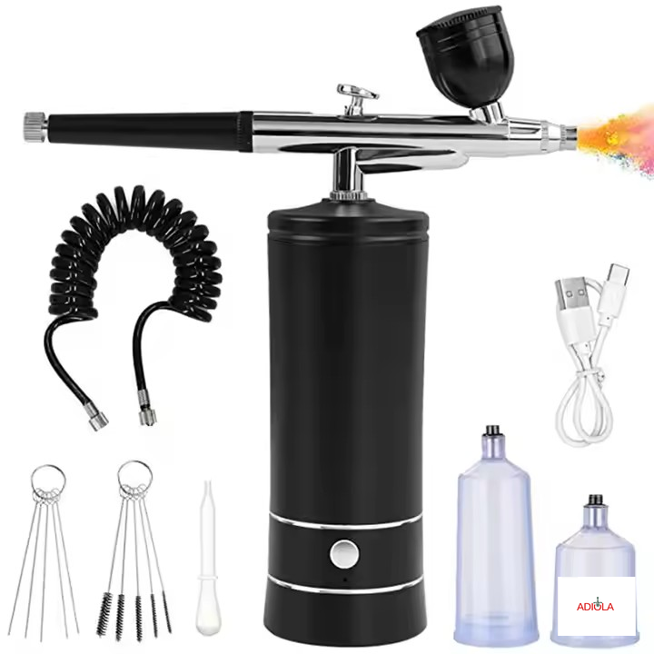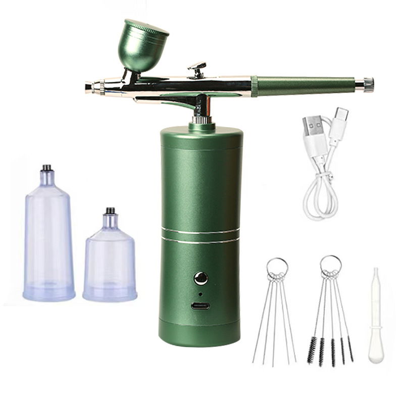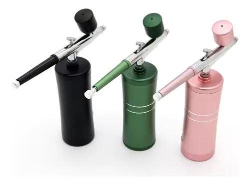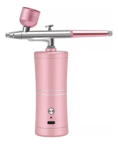 Este es un aerógrafo portátil de colores metálico, con un diseño moderno y elegante. La base cilíndrica sirve como compresor, mientras que la parte superior está equipada con una pistola de aire con detalles en metal cromado. Tiene una copa en la parte superior para contener el líquido o pintura, y una boquilla larga y precisa que permite pulverizar con gran control. Es ideal para maquillaje, repostería, manualidades, modelismo o nail art, gracias a su tamaño compacto, buena ergonomía y acabado profesional.