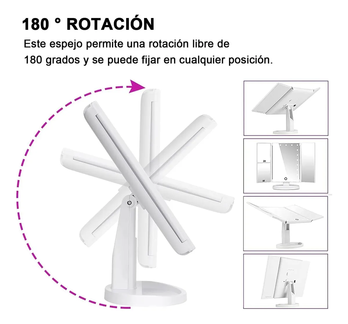 Rotación 180°: Gira el espejo y fíjalo en el ángulo ideal para mayor comodidad al maquillarte o peinarte.