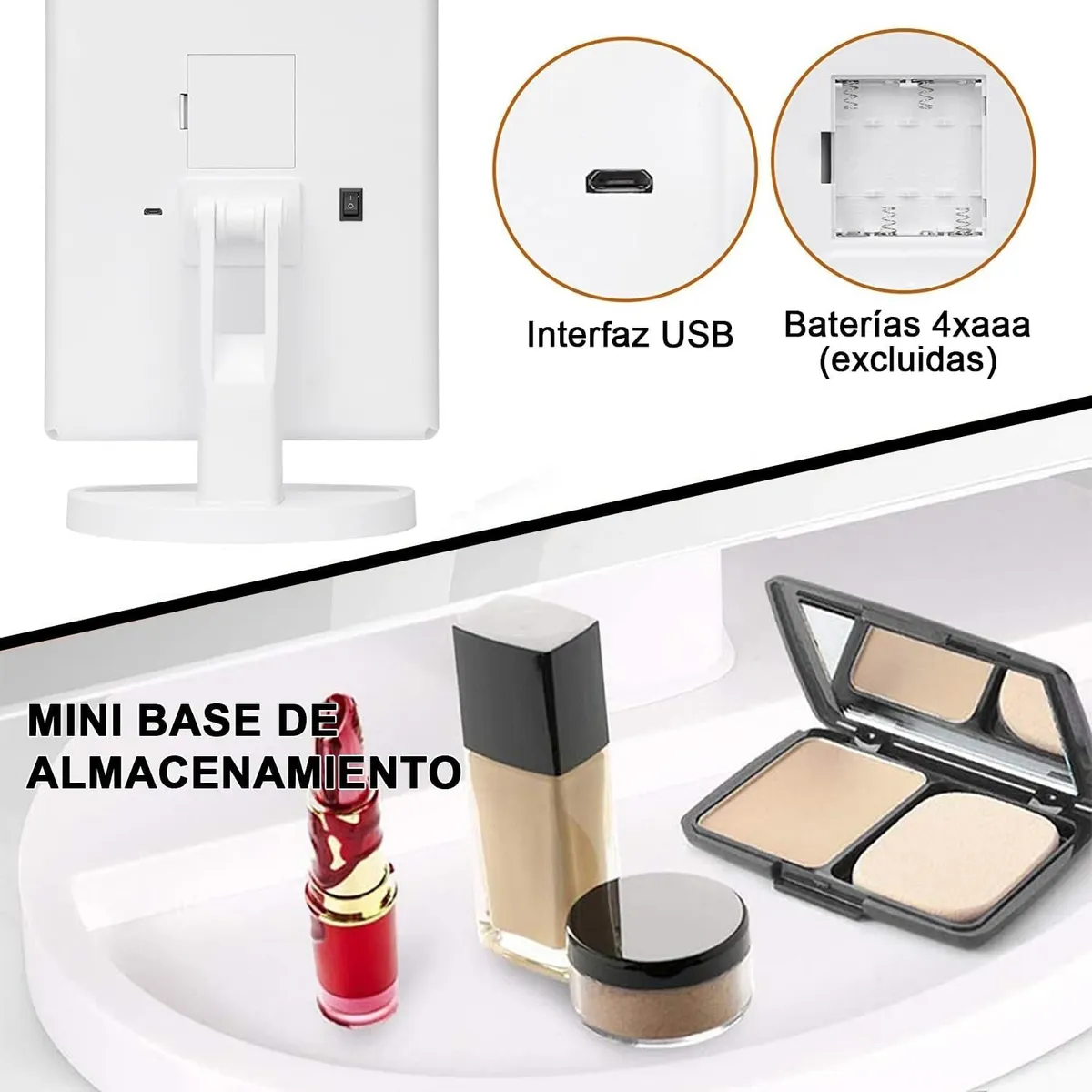 Luz LED Profesional: Iluminación uniforme y potente que simula la luz natural, esencial para la correcta aplicación del maquillaje y la selección de colores. Eficacia luminosa 300 lúmenes.