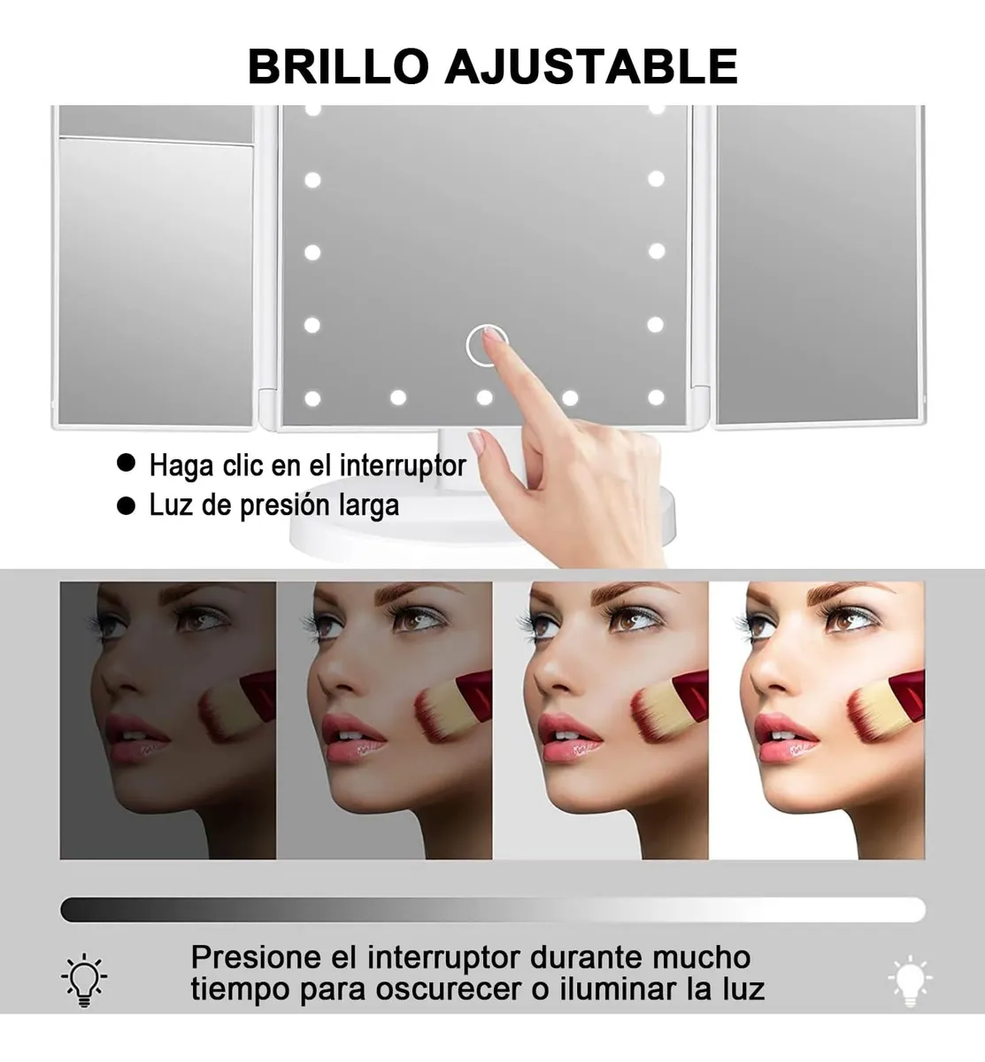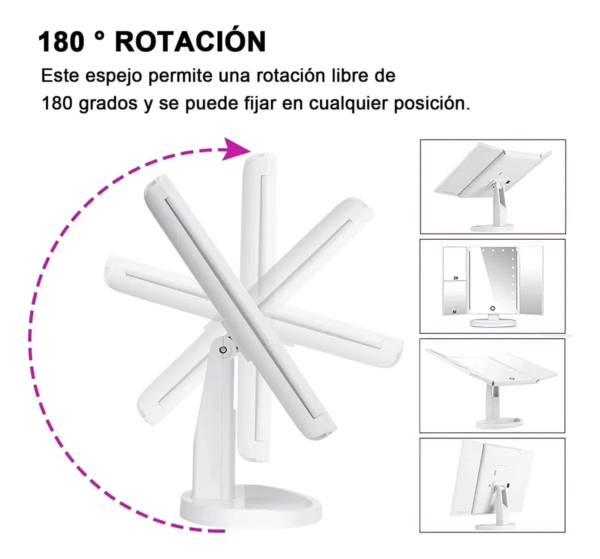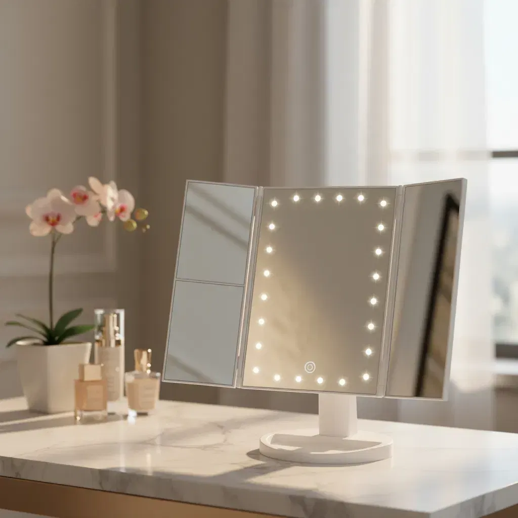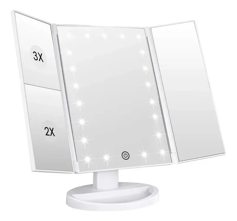 Descubre la combinación perfecta entre elegancia, funcionalidad y tecnología con el espejo de maquillaje con luz LED Xiangrui. Su diseño tríptico permite una visión completa del rostro desde diferentes ángulos, ideal para maquillaje, cuidado facial y peinado.