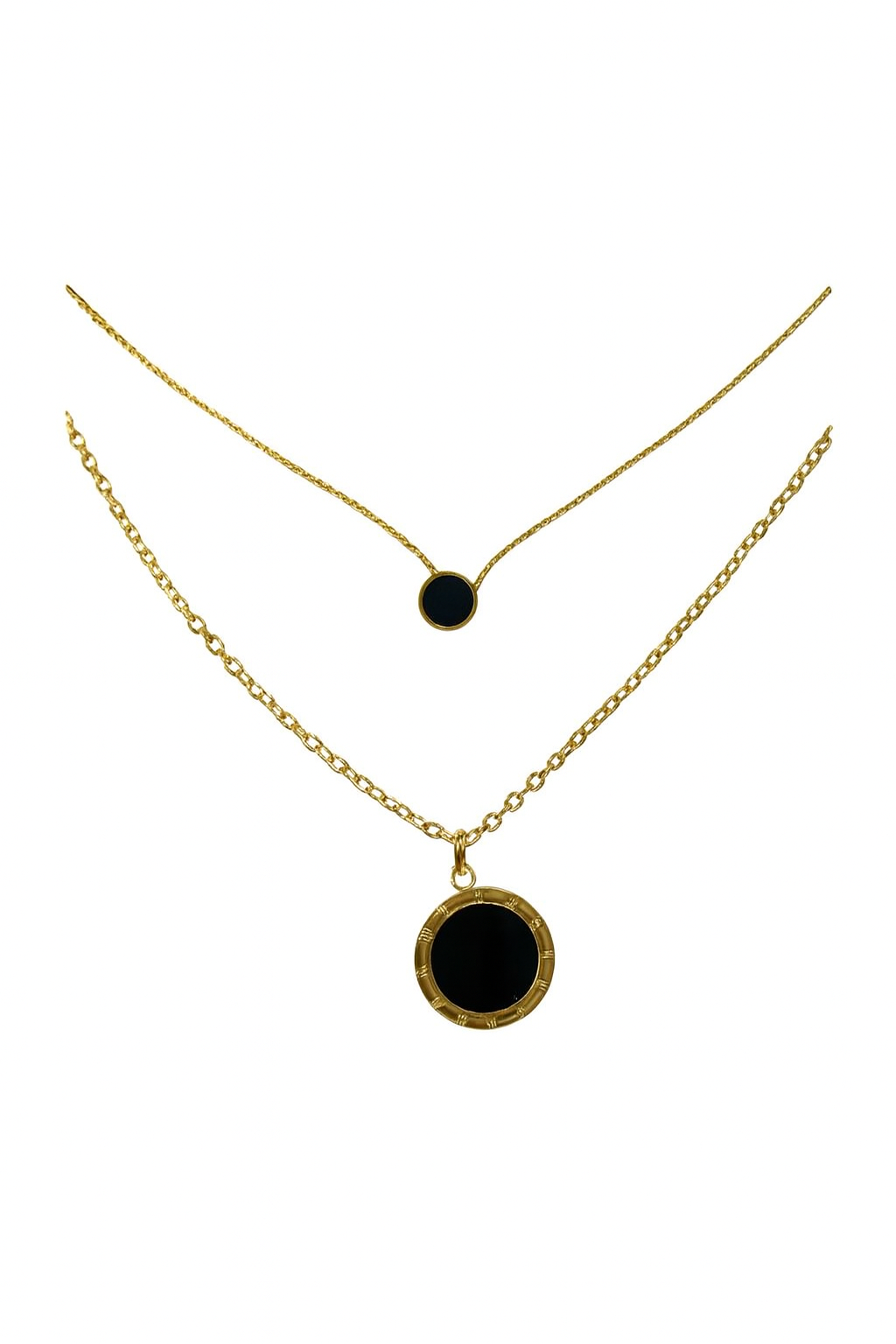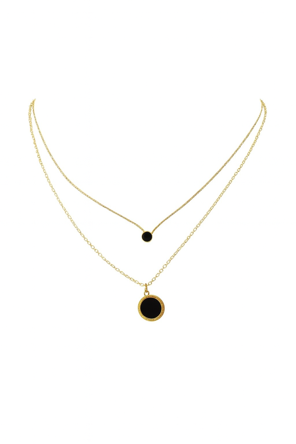 Doble capa en tono dorado con dijes negros, una combinación clásica y sofisticada que nunca pasa de moda.