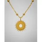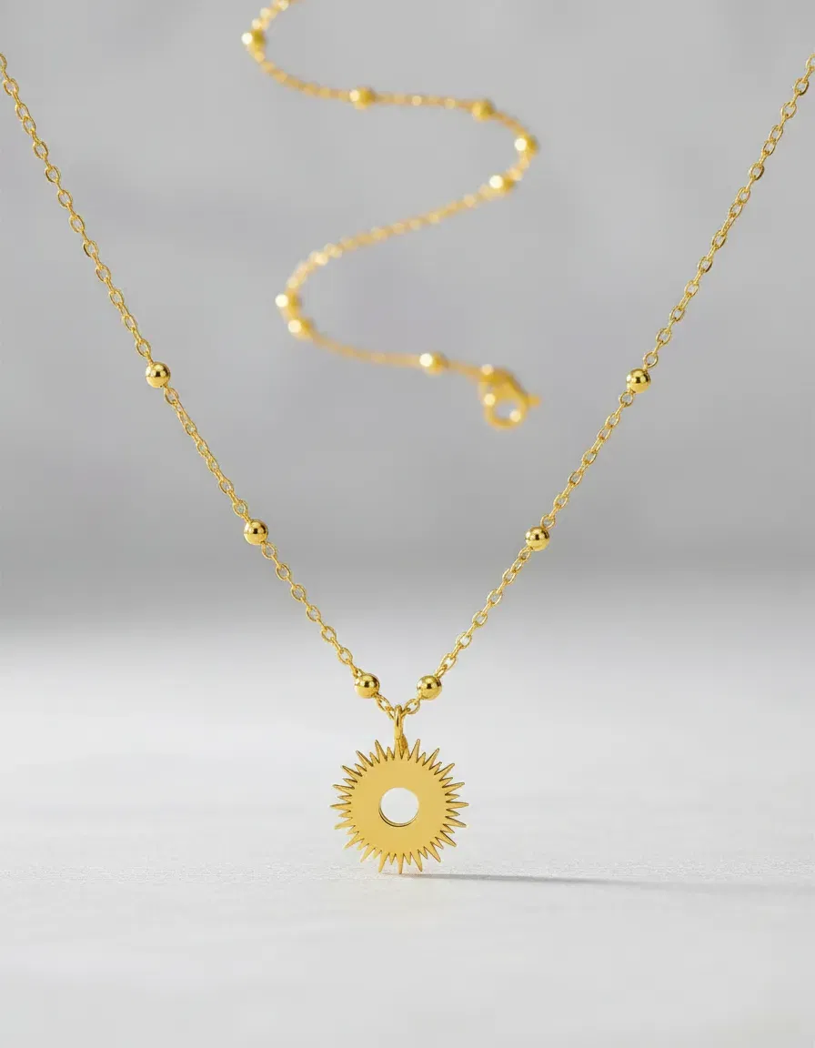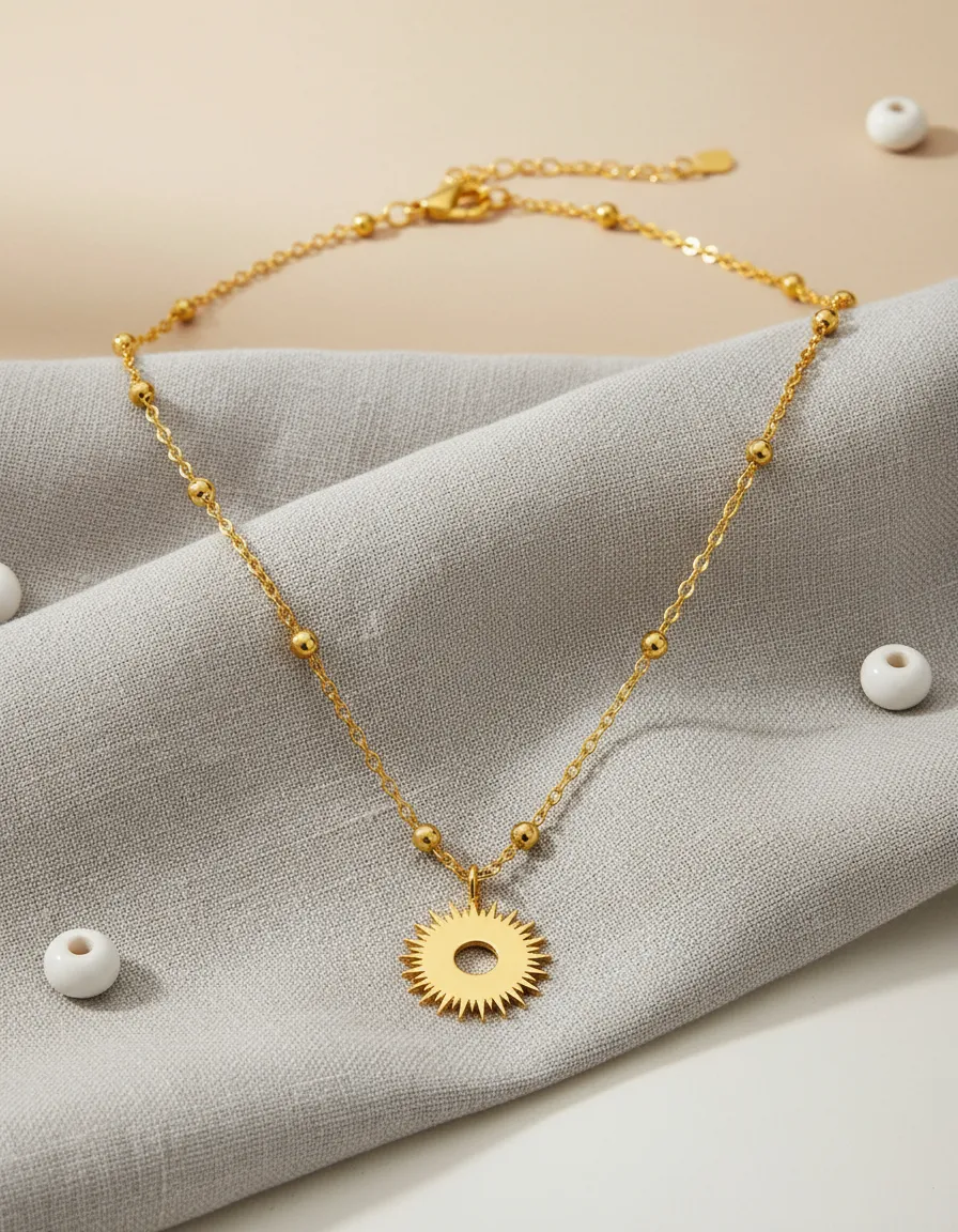 🌞 Diseño único y elegante: Este collar presenta un dije central con forma de sol radiante, símbolo de energía, vitalidad y luz. El acabado dorado le da un brillo sofisticado que realza cualquier outfit, desde casual hasta elegante.