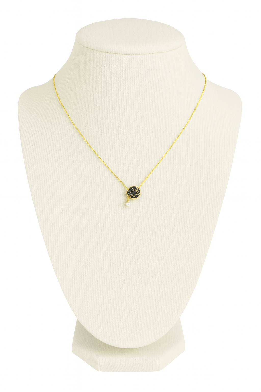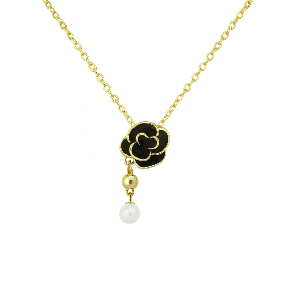 De la flor cuelga una perla blanca nacarada que contrasta con el negro del esmalte, generando un acabado fino y distinguido.