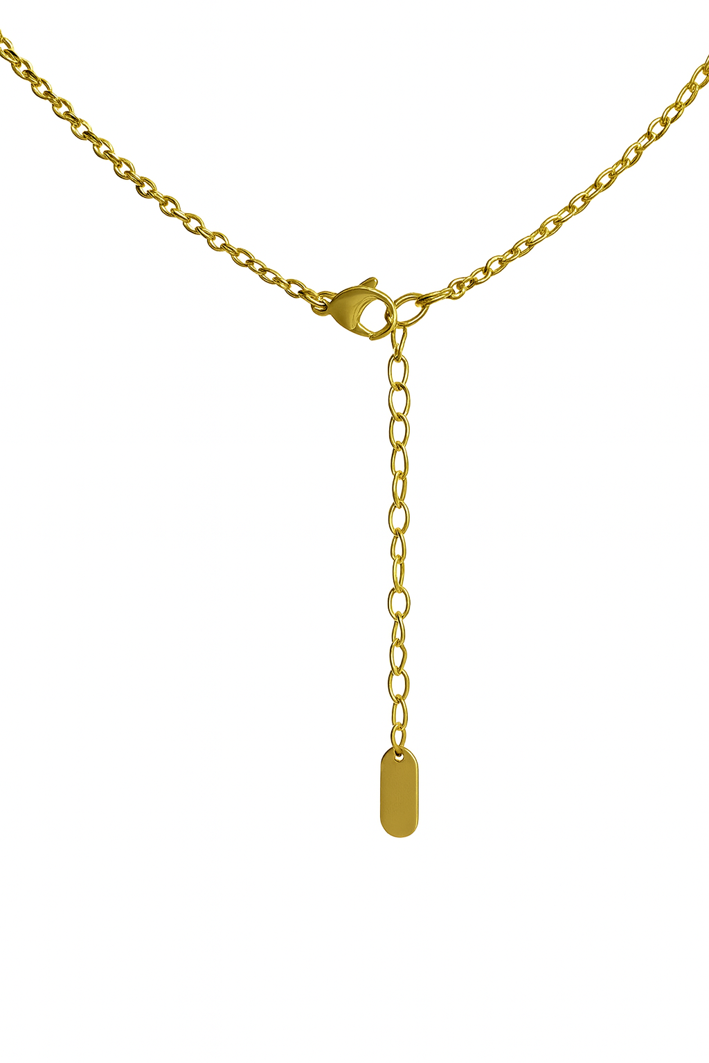 Este delicado collar está elaborado en acero quirúrgico hipoalergénico, reconocido por su resistencia y durabilidad, y cuenta con un baño de oro 18K que le otorga un brillo sofisticado y elegante.