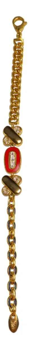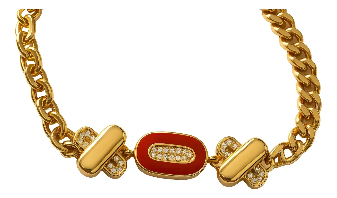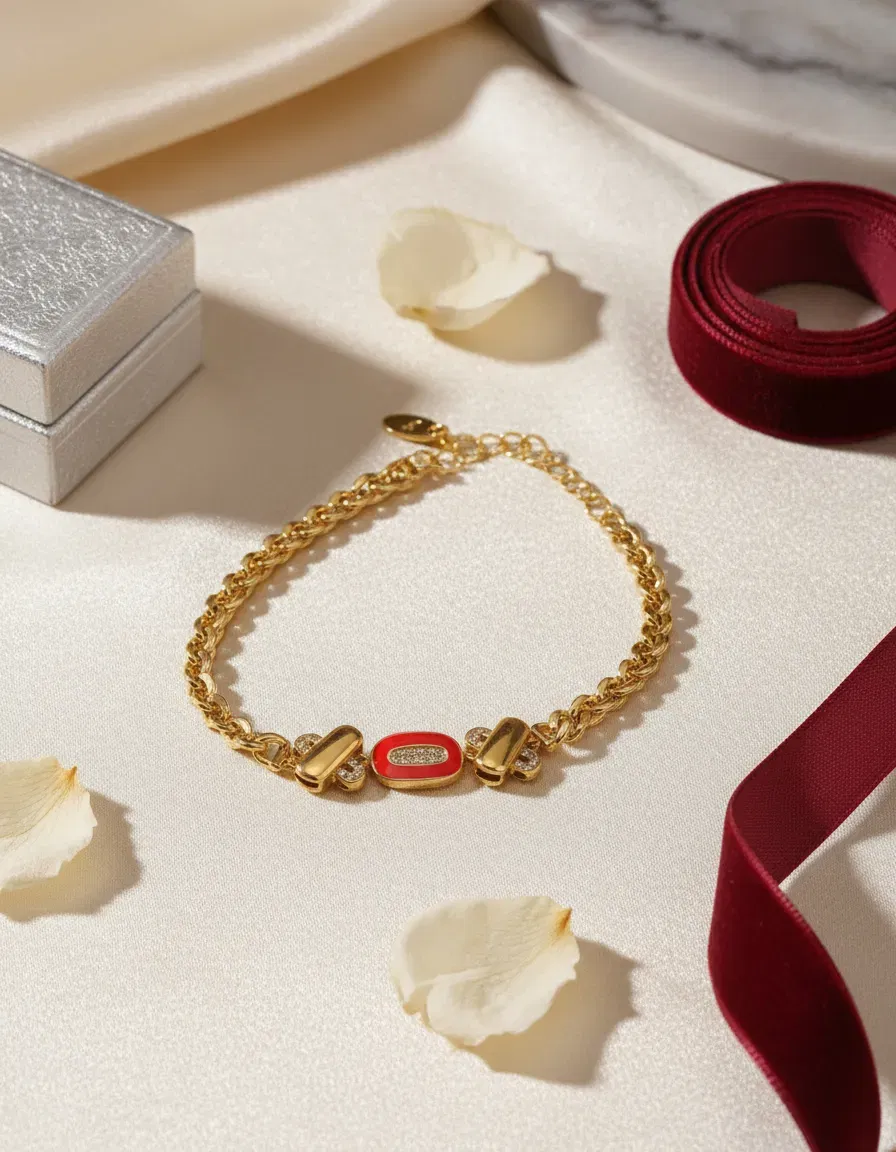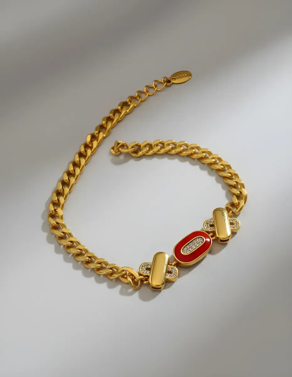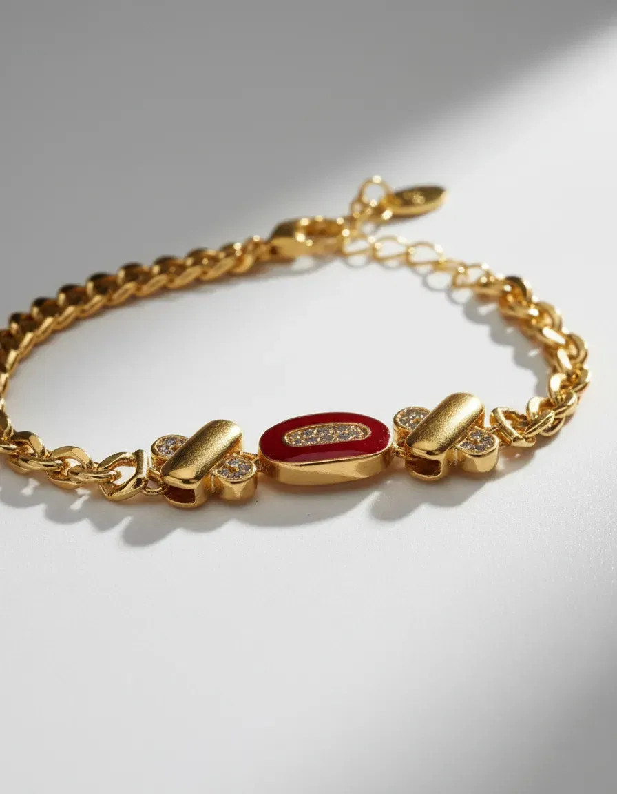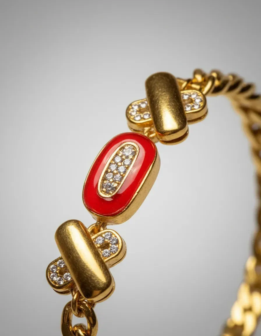 Diseño: Elegante estructura tipo eslabón con centro ovalado en esmalte rojo intenso, acompañado por delicados detalles laterales con circonias blancas engarzadas que aportan un brillo sutil y sofisticado.