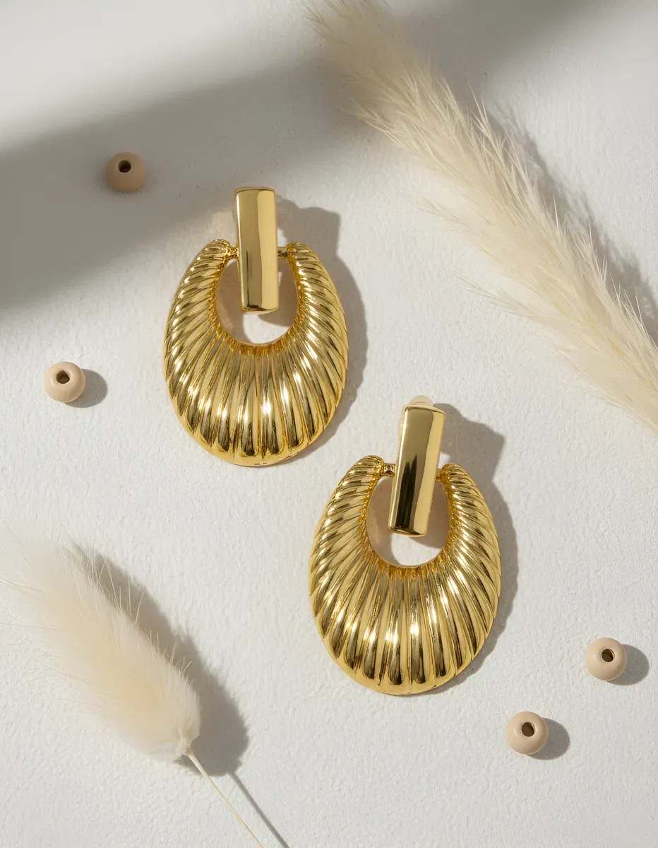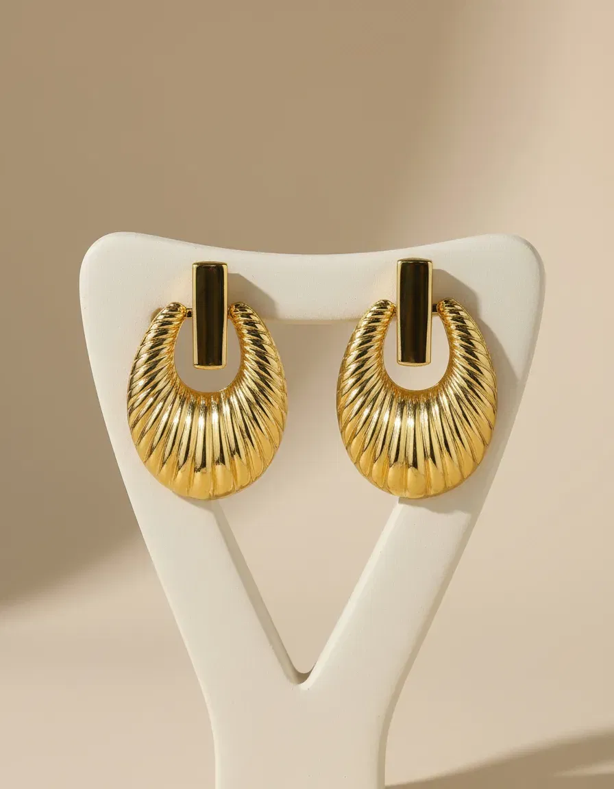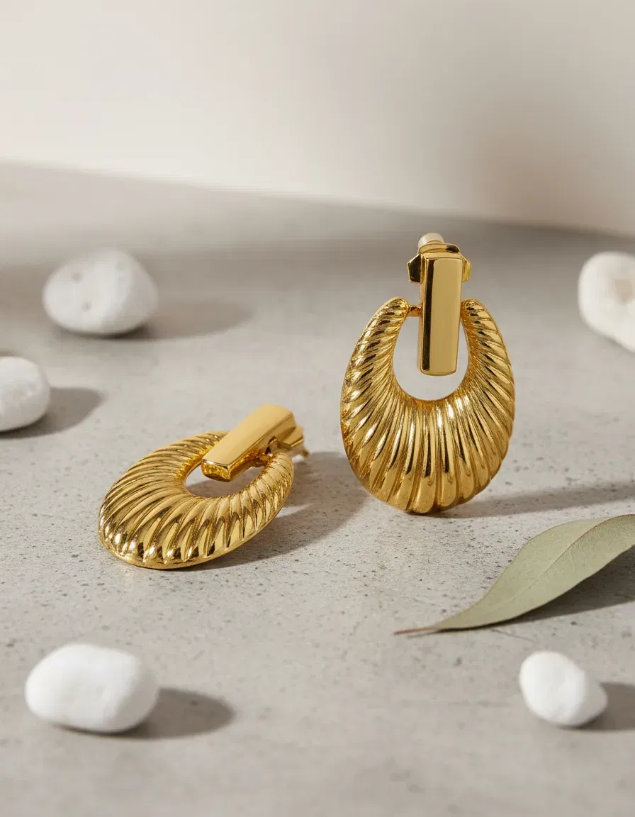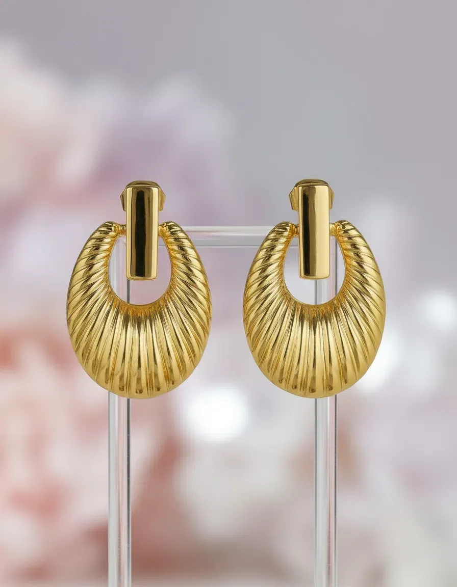 Aros de argolla con diseño texturado, elaborados en acero quirúrgico hipoalergénico y recubiertos con un baño de oro 18K que aporta brillo, durabilidad y un acabado sofisticado.