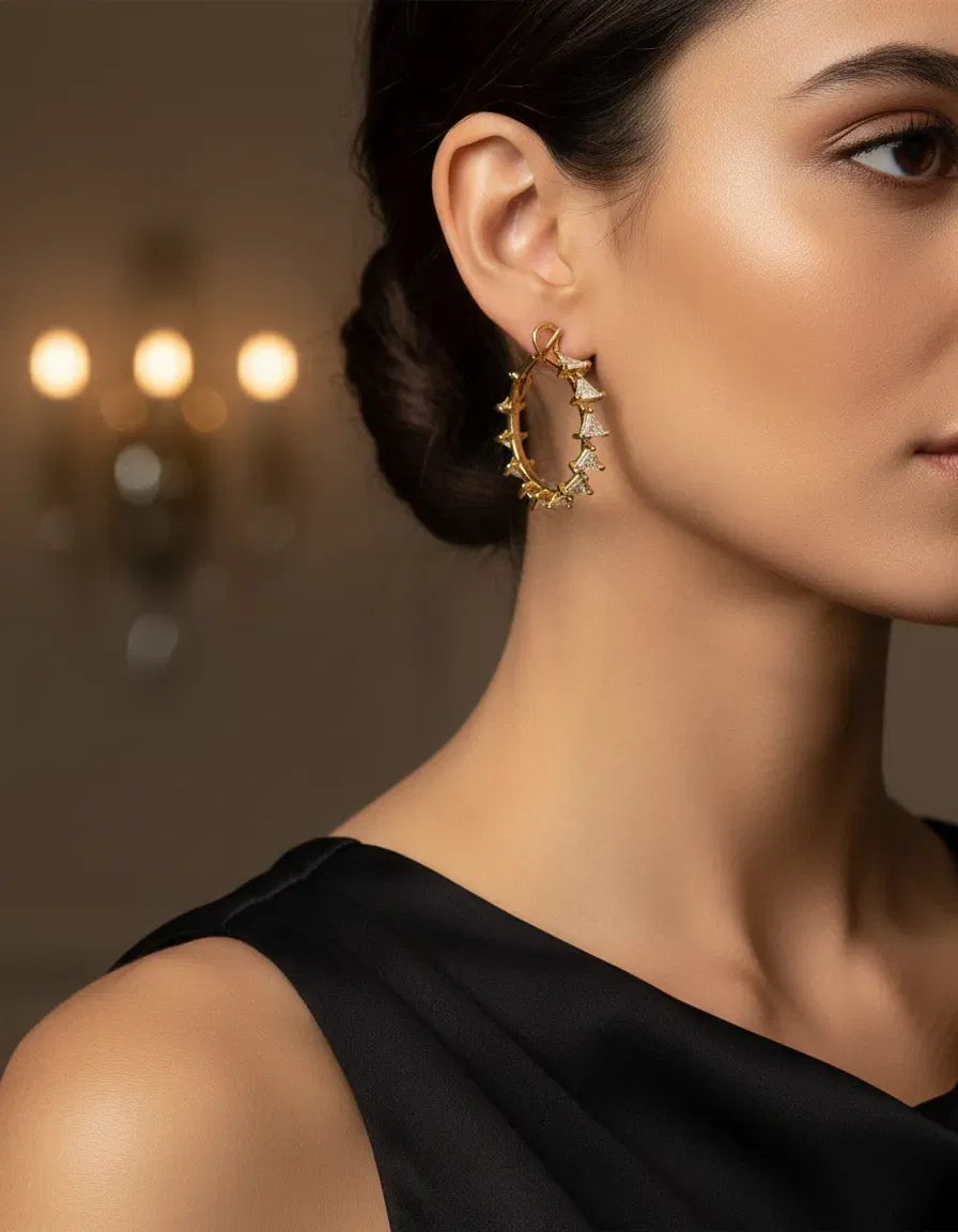 🔹 Diseño Exclusivo: Aro redondo con delicados detalles en forma triangular engarzados alrededor, logrando un estilo único y llamativo.