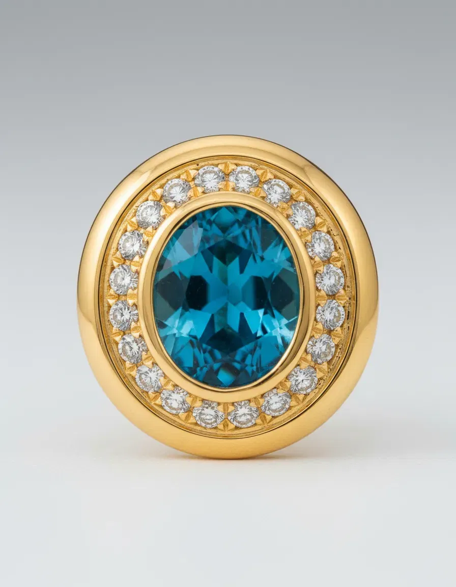 Su diseño circular destaca por una piedra central color celeste, que aporta un toque de frescura y luminosidad. A su alrededor, un delicado aro de circonias blancas resalta el brillo del centro, creando un contraste elegante y refinado.