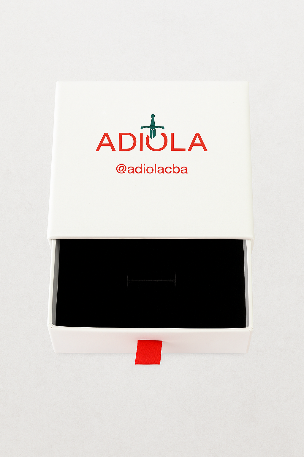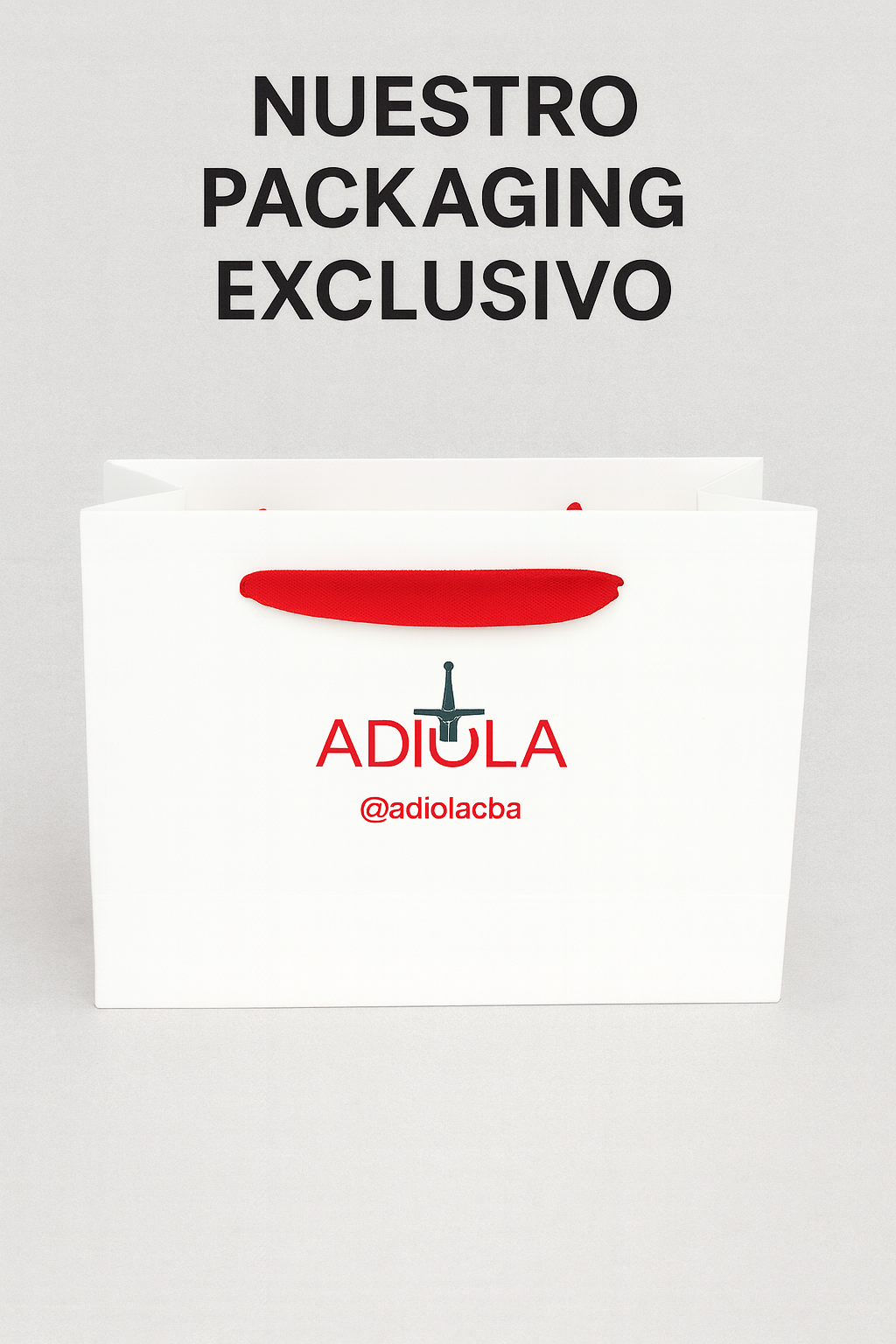 El packaging de Adiola está diseñado para realzar la experiencia de compra y transmitir elegancia desde el primer contacto. Consta de una bolsa rígida de papel de alta calidad y una caja deslizable tipo cajón, ambas en color blanco puro, que resalta la sobriedad y sofisticación de la marca.