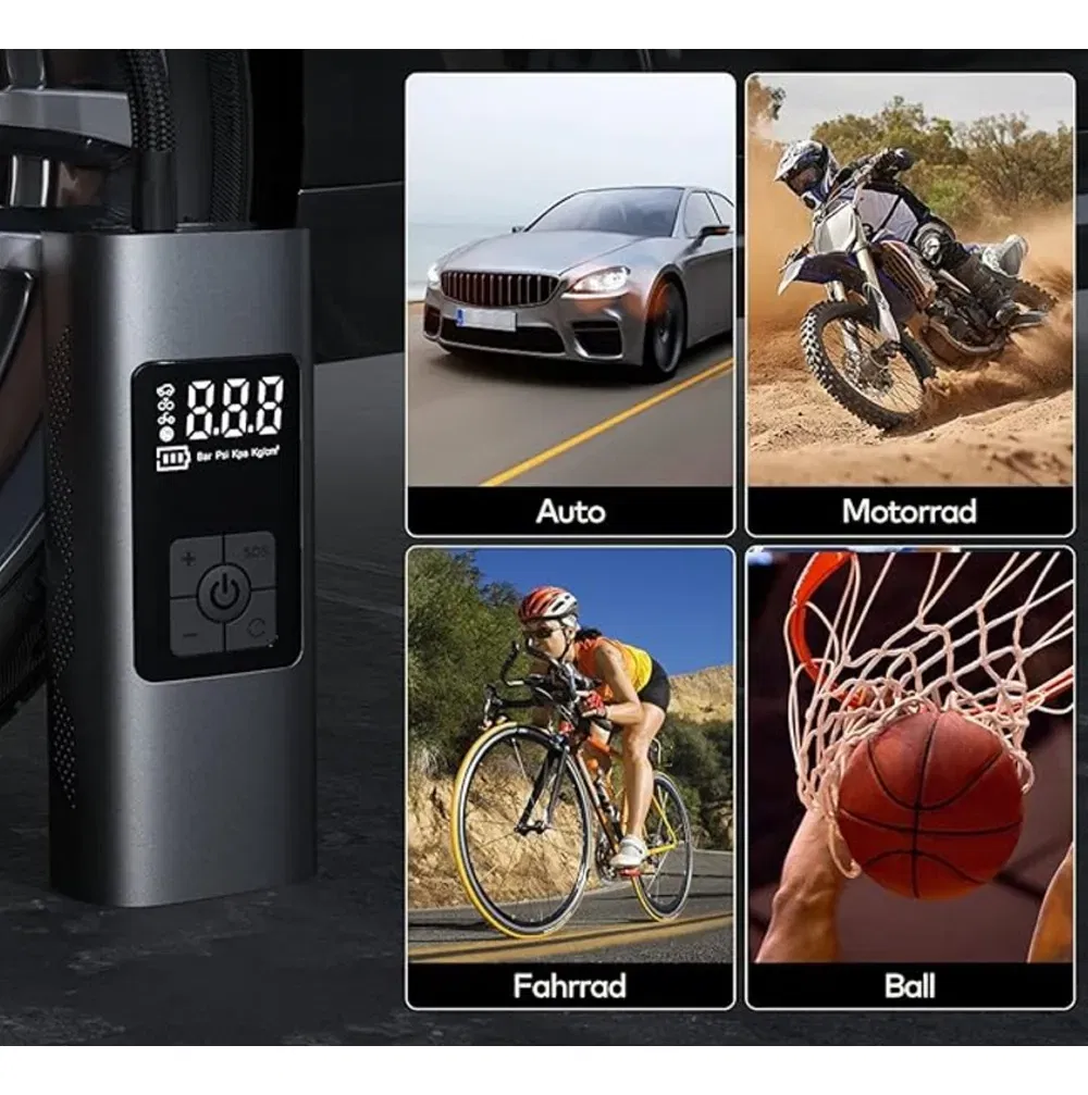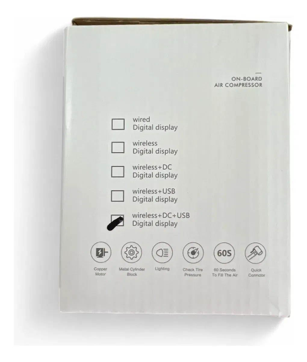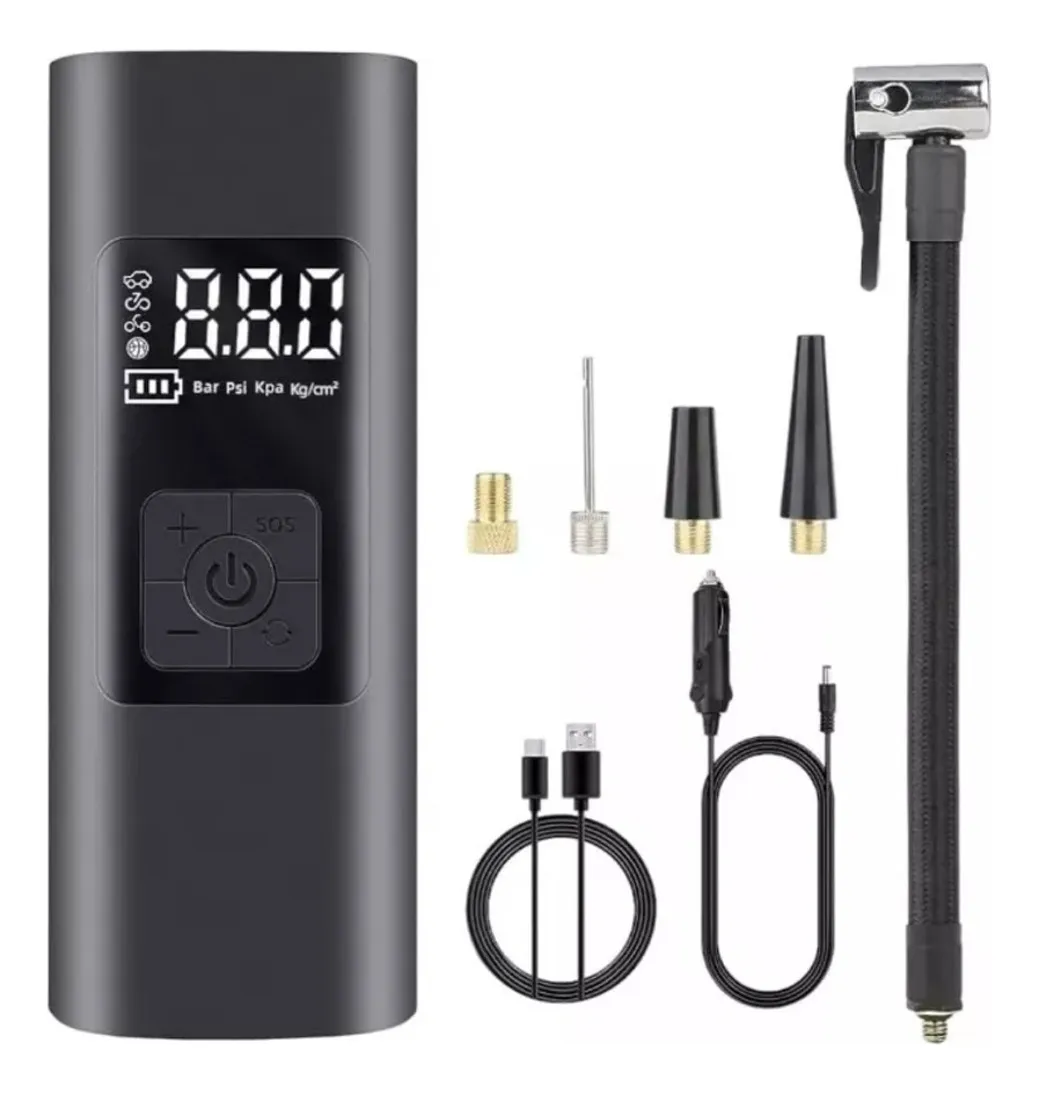 Este compresor de aire portátil digital es una herramienta compacta, moderna y versátil, diseñada para inflar neumáticos de autos, motos, bicicletas, pelotas y flotadores de manera rápida y segura. Su pantalla LED de alta definición permite controlar con precisión la presión en Bar, Psi, Kpa y Kg/cm², ofreciendo comodidad y seguridad en todo momento.