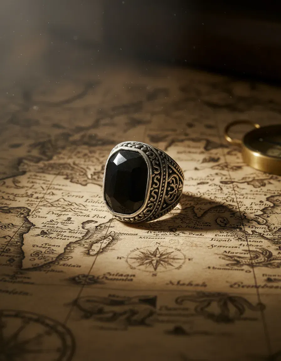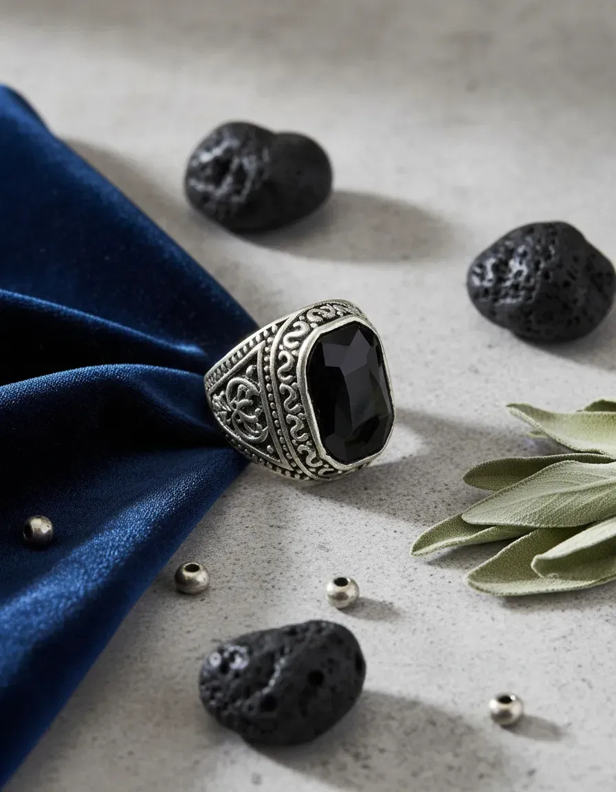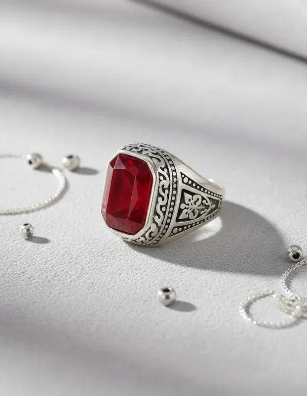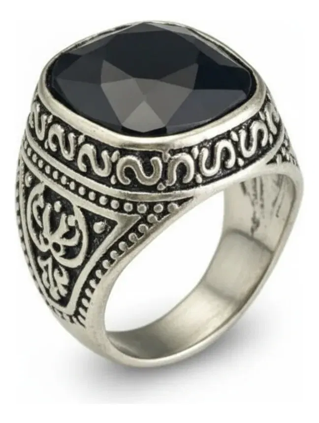 💎 Piedra central: 1,5 cm x 1,2 cm aprox. Corte rectangular facetado en tonos rojo o negro, que resaltan su brillo y profundidad.