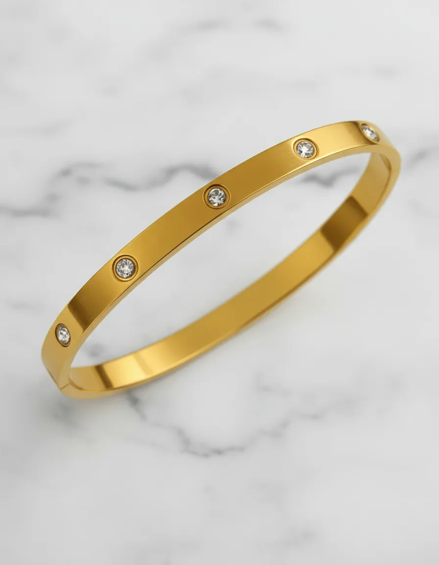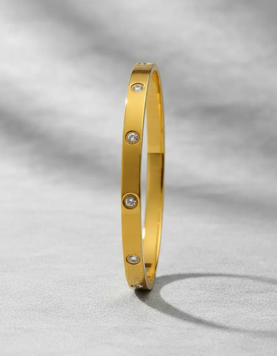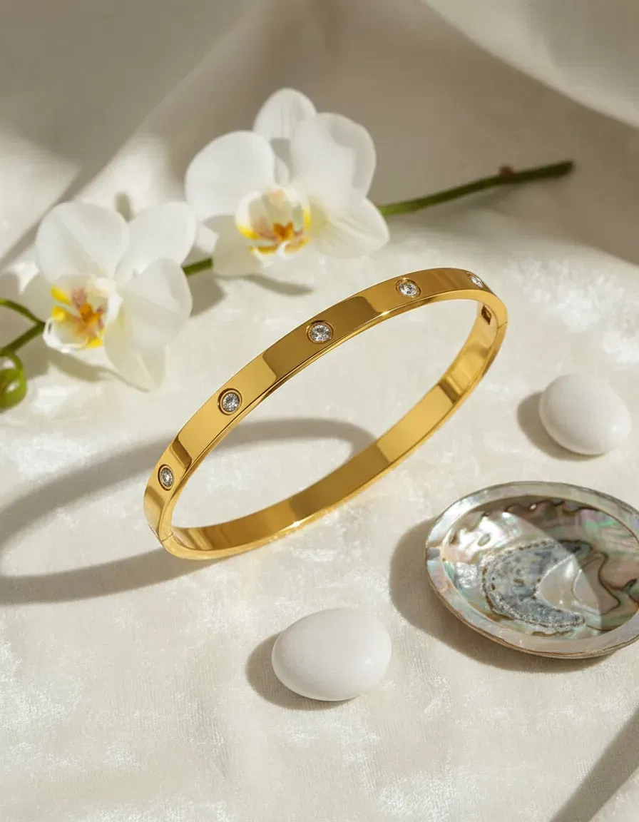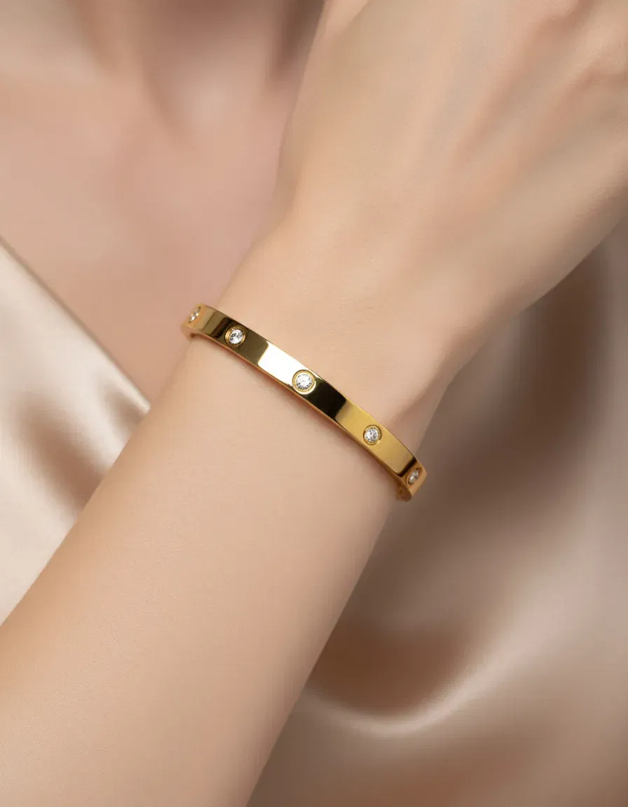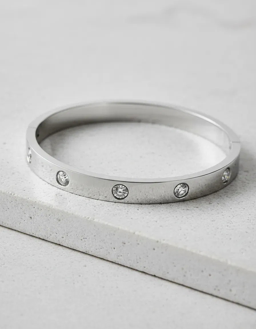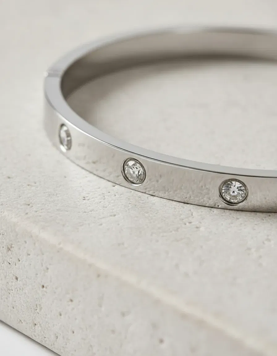 Pulsera rígida de acero quirúrgico hipoalergénico, disponible en dos elegantes acabados: baño de oro amarillo 18K o plata 925. Su diseño minimalista incorpora brillantes circonias incrustadas de forma equidistante, logrando un equilibrio perfecto entre sobriedad y lujo.