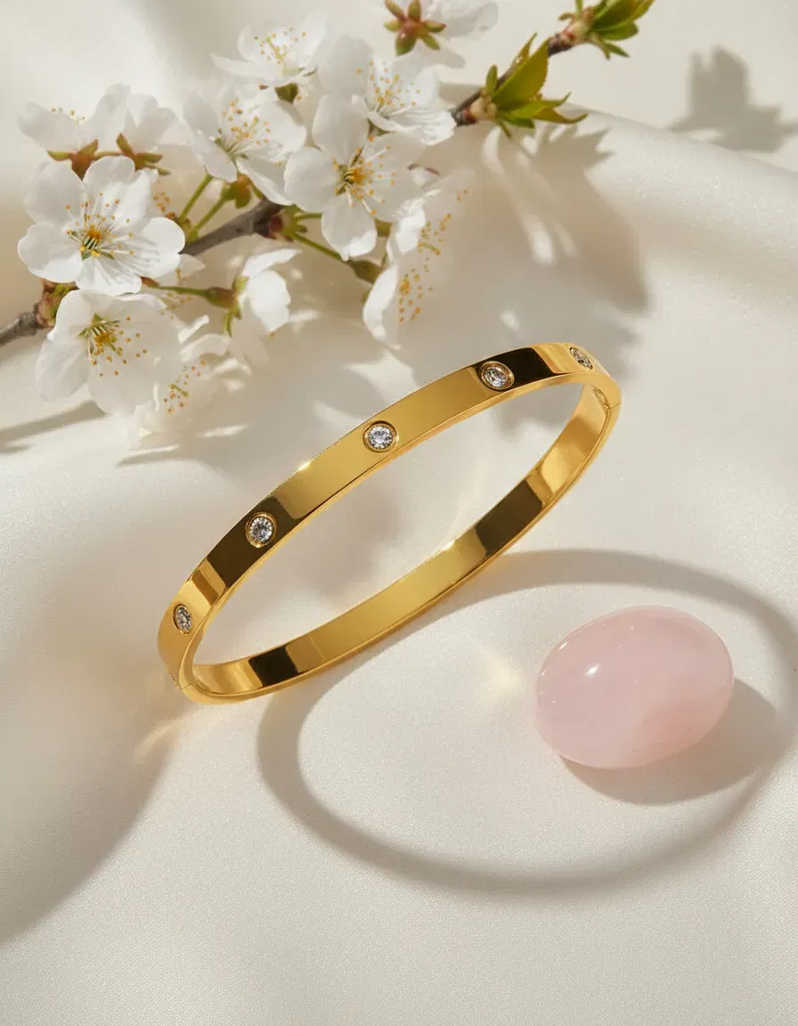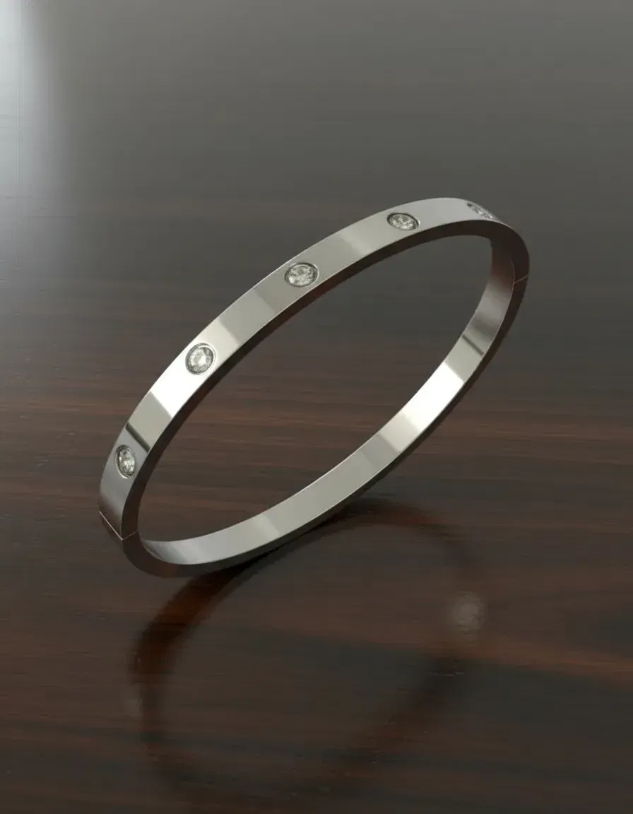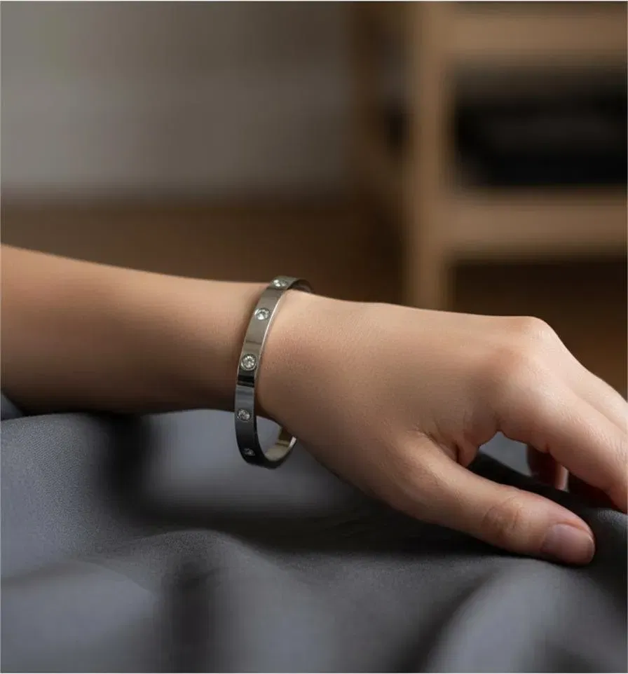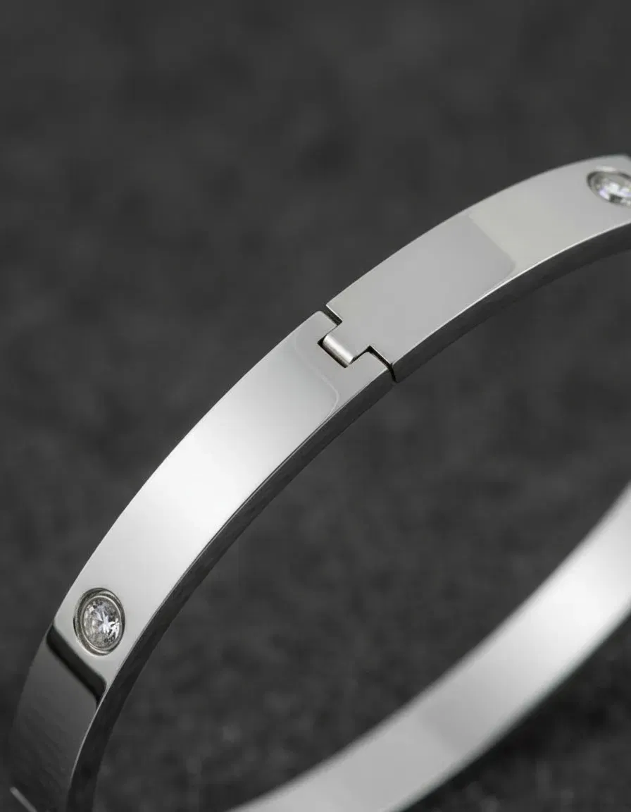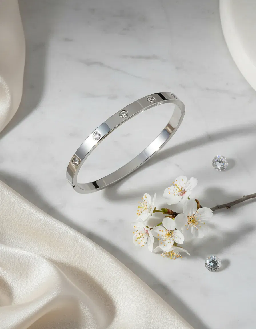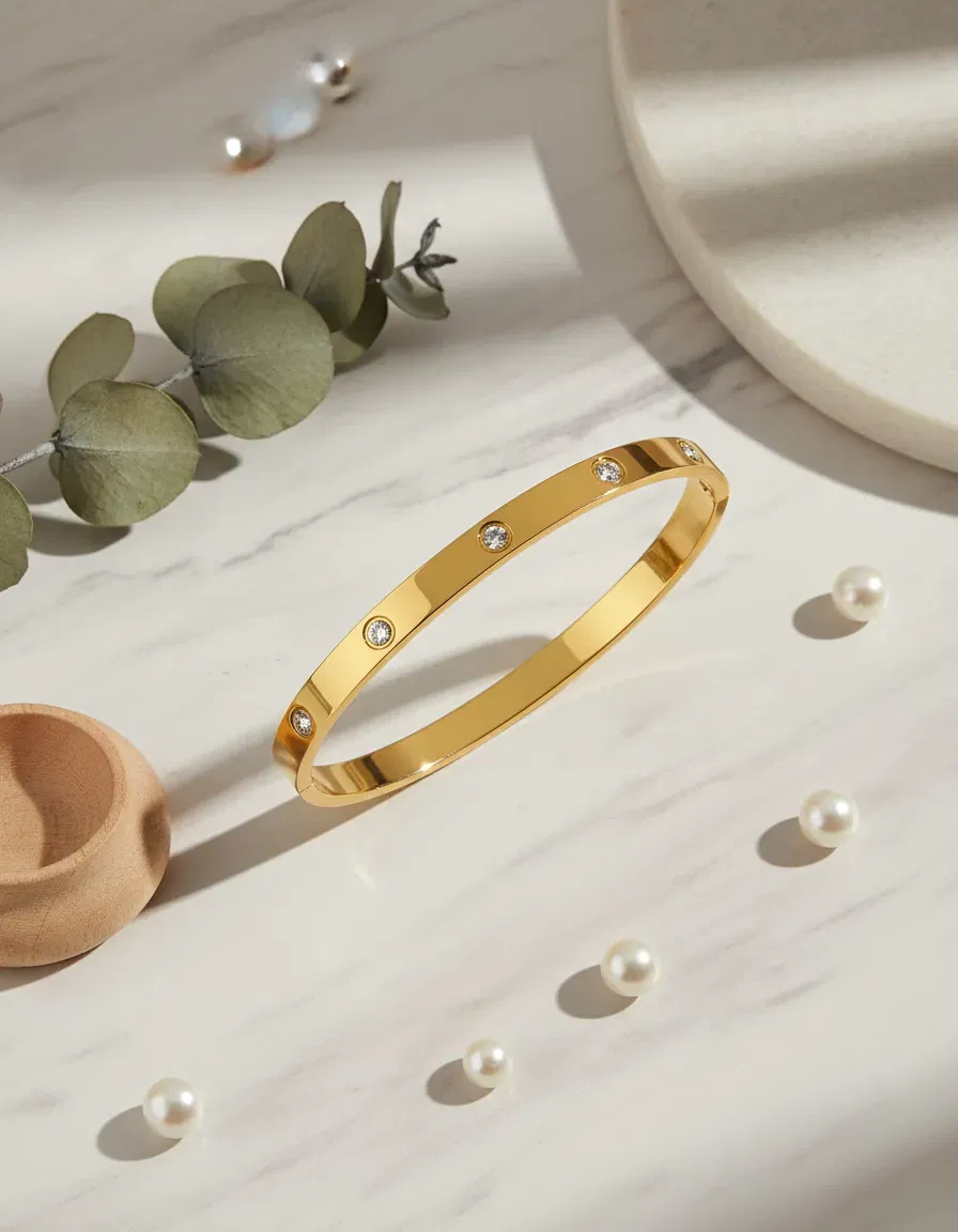 Pulsera rígida de acero quirúrgico hipoalergénico, disponible en dos elegantes acabados: baño de oro amarillo 18K o plata 925. Su diseño minimalista incorpora brillantes circonias incrustadas de forma equidistante, logrando un equilibrio perfecto entre sobriedad y lujo.