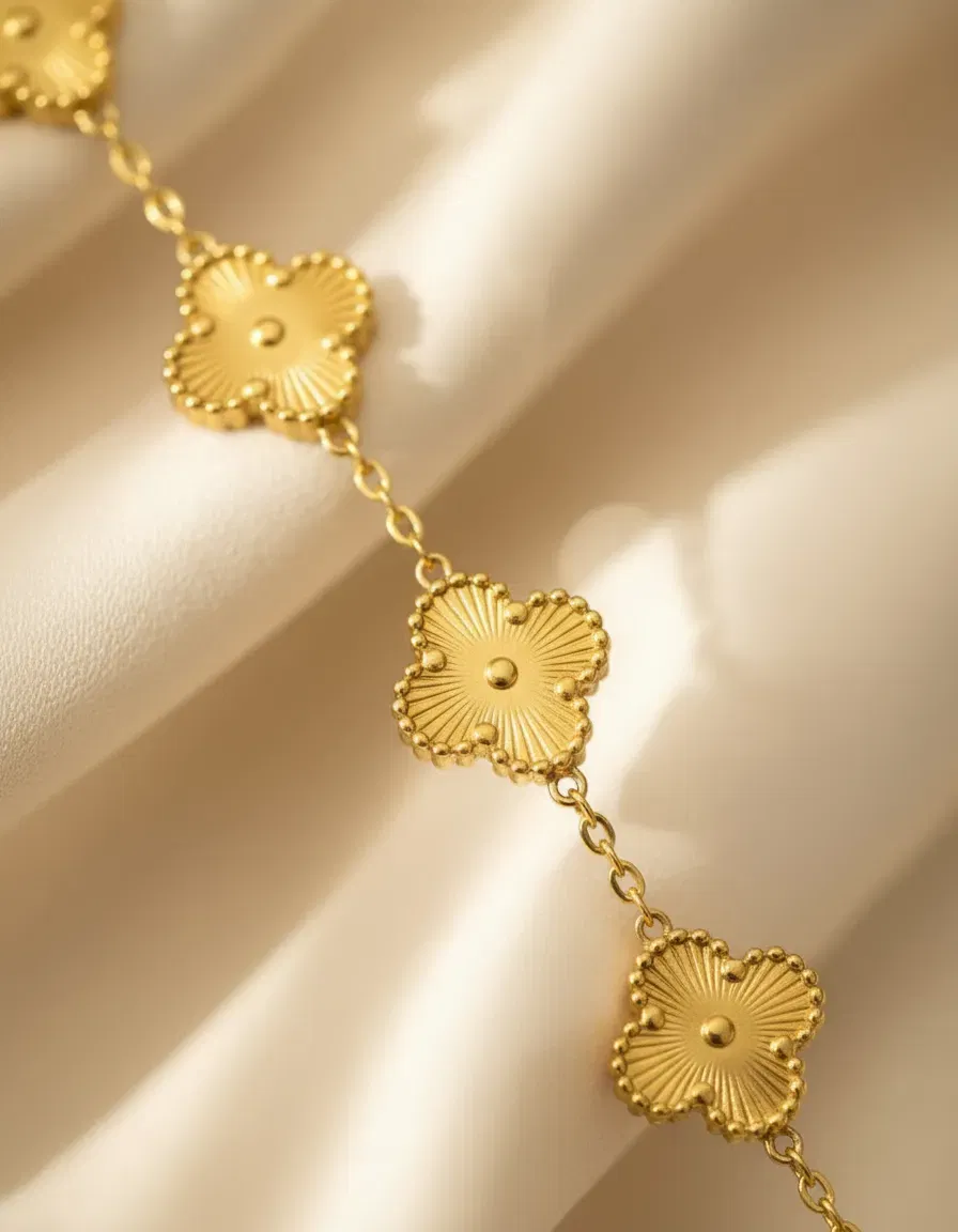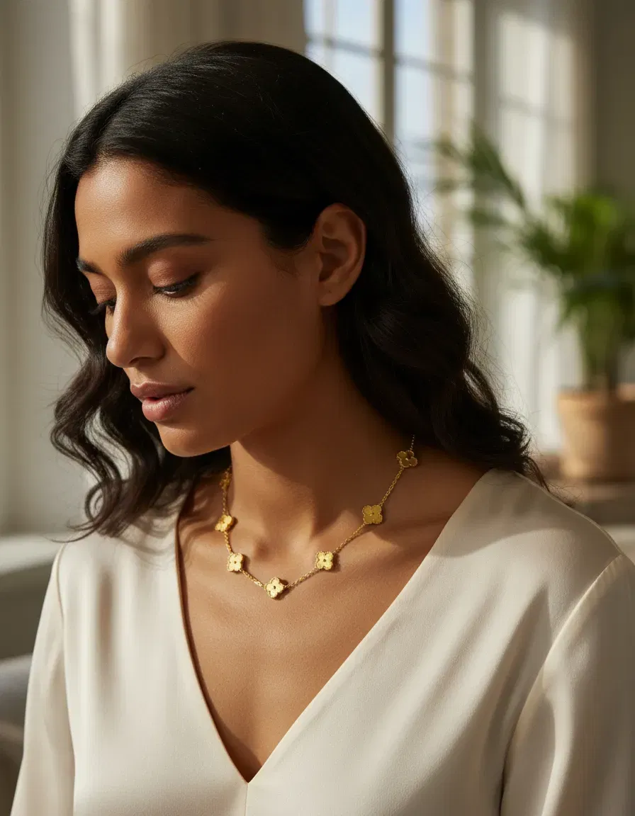 Collar regulable: 40 +7 cm de extensión, con varios tréboles distribuidos de forma armónica, realza el escote con un estilo moderno y glamuroso.