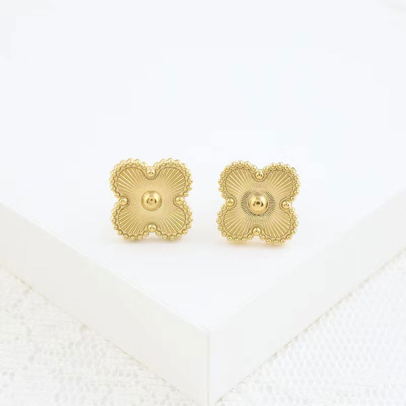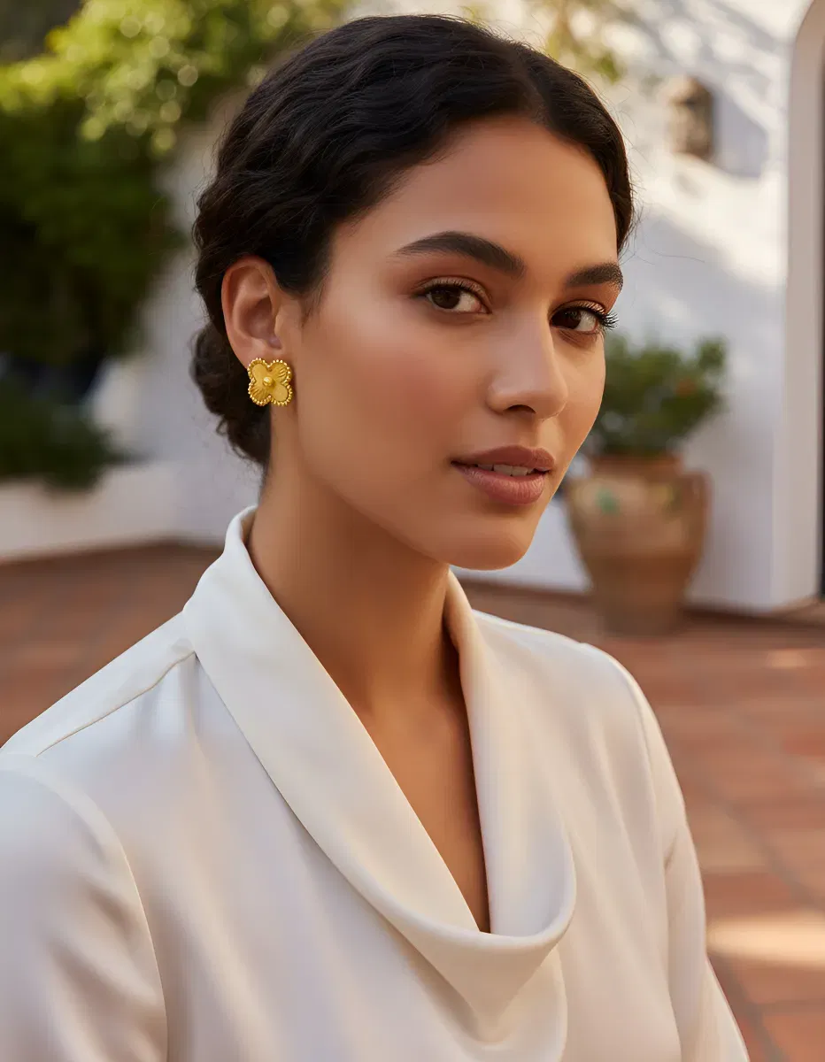 Aros tipo botón: ligeros y cómodos, con forma de trébol ( 1 cm aprox.) dorado que ilumina el rostro.